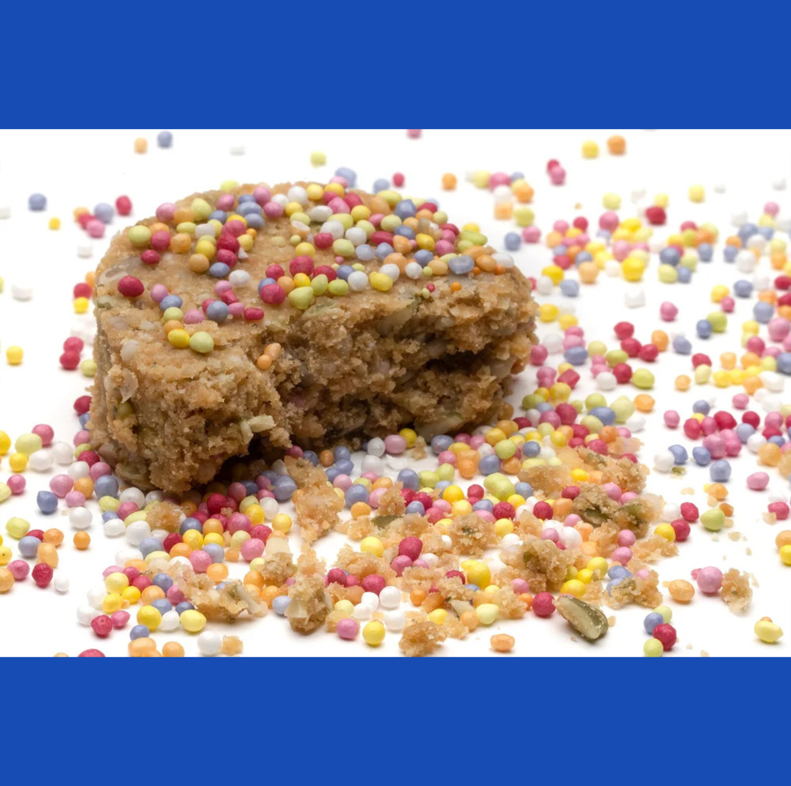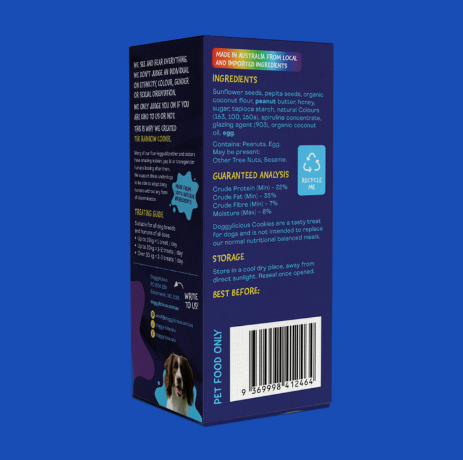 Delight your dog's taste buds with Doggylicious Rainbow Cookies! These colourful treats are packed with natural ingredients and offer a fun and healthy snack. Made with a blend of sunflower seeds, pepita seeds, and coconut flour, they provide essential nutrients and a satisfying crunch. Each cookie is naturally coloured using plant-based ingredients, making them a guilt-free treat for your furry friend.