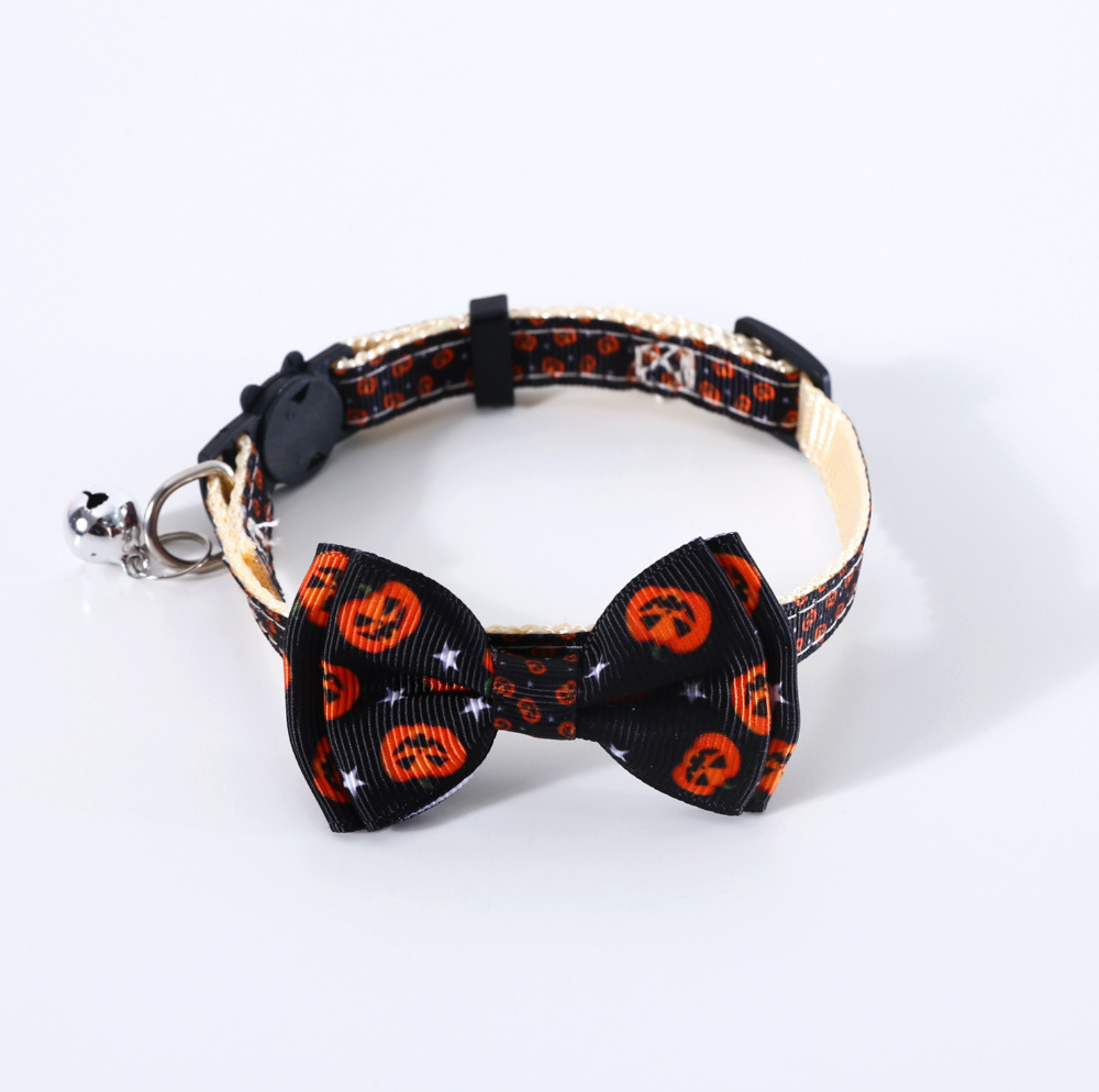 Halloween Bow Tie Cat & Dog Collar – Pumpkin Print with Bell (Adjustable Breakaway Design)