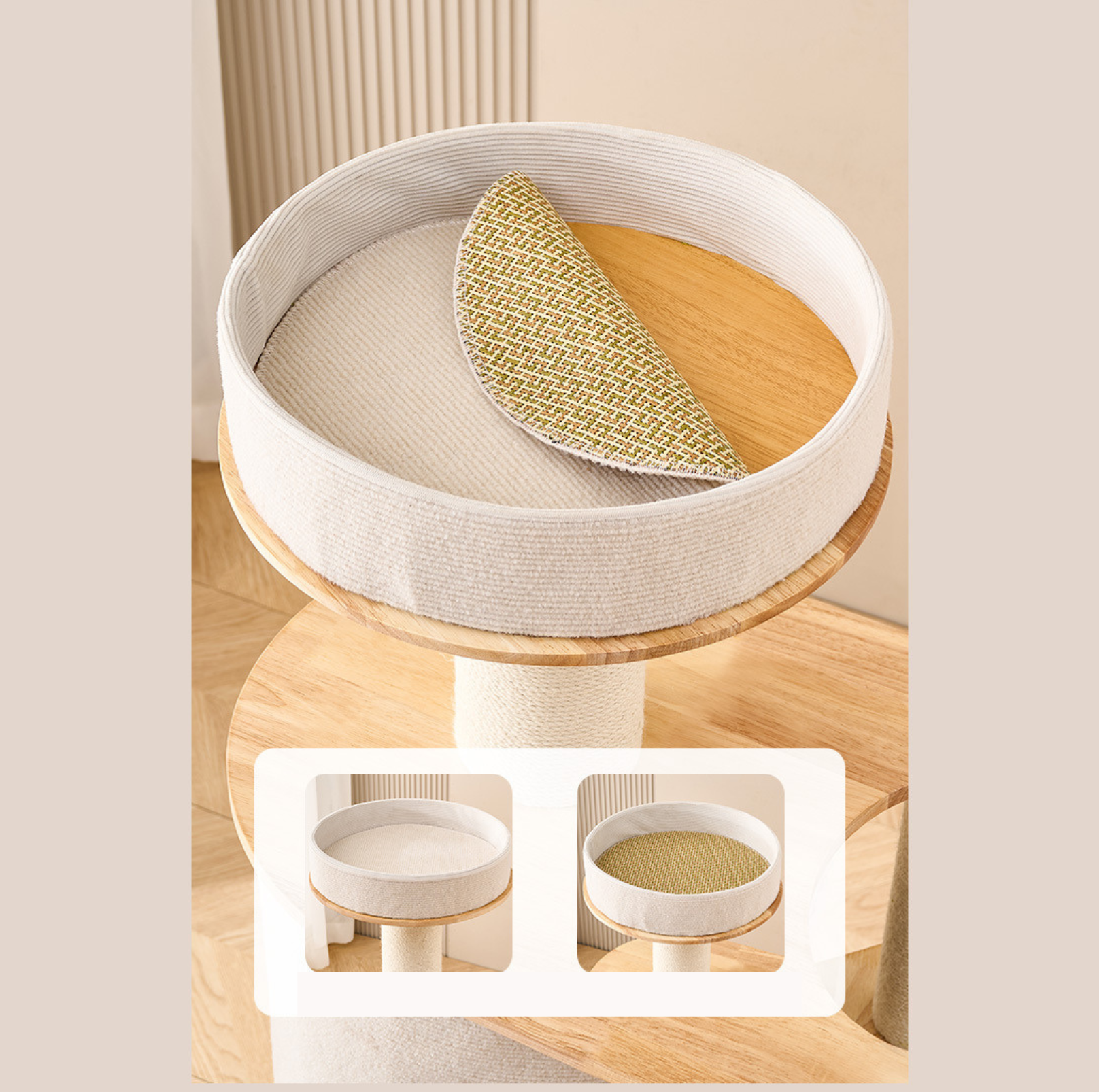 - Natural Sisal Scratching Posts: White sisal rope wrapped tightly around rigid tubes supports daily claw care and helps protect furniture.