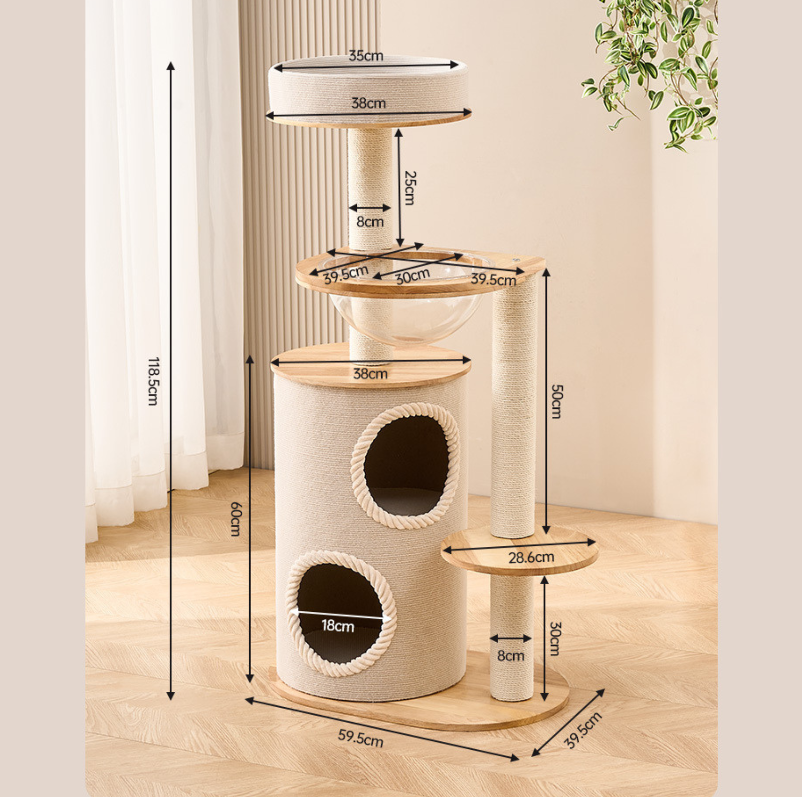 Solid wood, Scratching posts: Hard paper tube wrapped with natural white sisal rope, and Clear acrylic